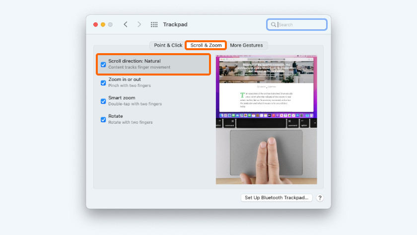 - Check if there's a checkmark next to 'Scroll direction: natural' in the 'Scroll and zoom' tab.