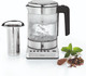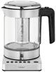 Dit is een enorm fraaie, degelijke en handige waterkoker van het bekende Duitse merk WMF die in de top 3 een plaatsje verdient! Hij is mooi uitgevoerd van een speciaal soort supersterk glas en deels roestvrij staal, dus geen plastic rommel. Je kunt heel eenvoudig 5 temperaturen kiezen tussen 60 en 100 graden. Hij kookt enorm snel, nog sneller dan de diverse waterdispencers. En je kunt er ook kleine hoeveelheden in koken. Tijdens het verhitten brandt rondom een ring van blauwe led-lampjes die vooral in het donker het borrelende water heel spacy verlichten. Dat is natuurlijk niet het belangrijkste, maar wel leuk en mooi om te zien ;) Met de zeer fijnmazige roestvrijstalen zeef kun je in dezelfde pot thee zetten en 20 minuten warm houden. Wij gebruiken daarin altijd losse biologische thee, dat is véél lekkerder dan zakjes, maar ook voordeliger en veel milieuvriendelijker. De gebruikte theebladeren gooien we in de tuin. Het is een vrij compact apparaat en dus ook handig voor kleine keukens. Hij is slechts 13 cm. breed, zoals een cd-doosje en 16 cm. diep. Maar de inhoud van 1 liter is voldoende voor 4 grote theeglazen of 6 á 7 kopjes. Ik ben er erg blij mee.